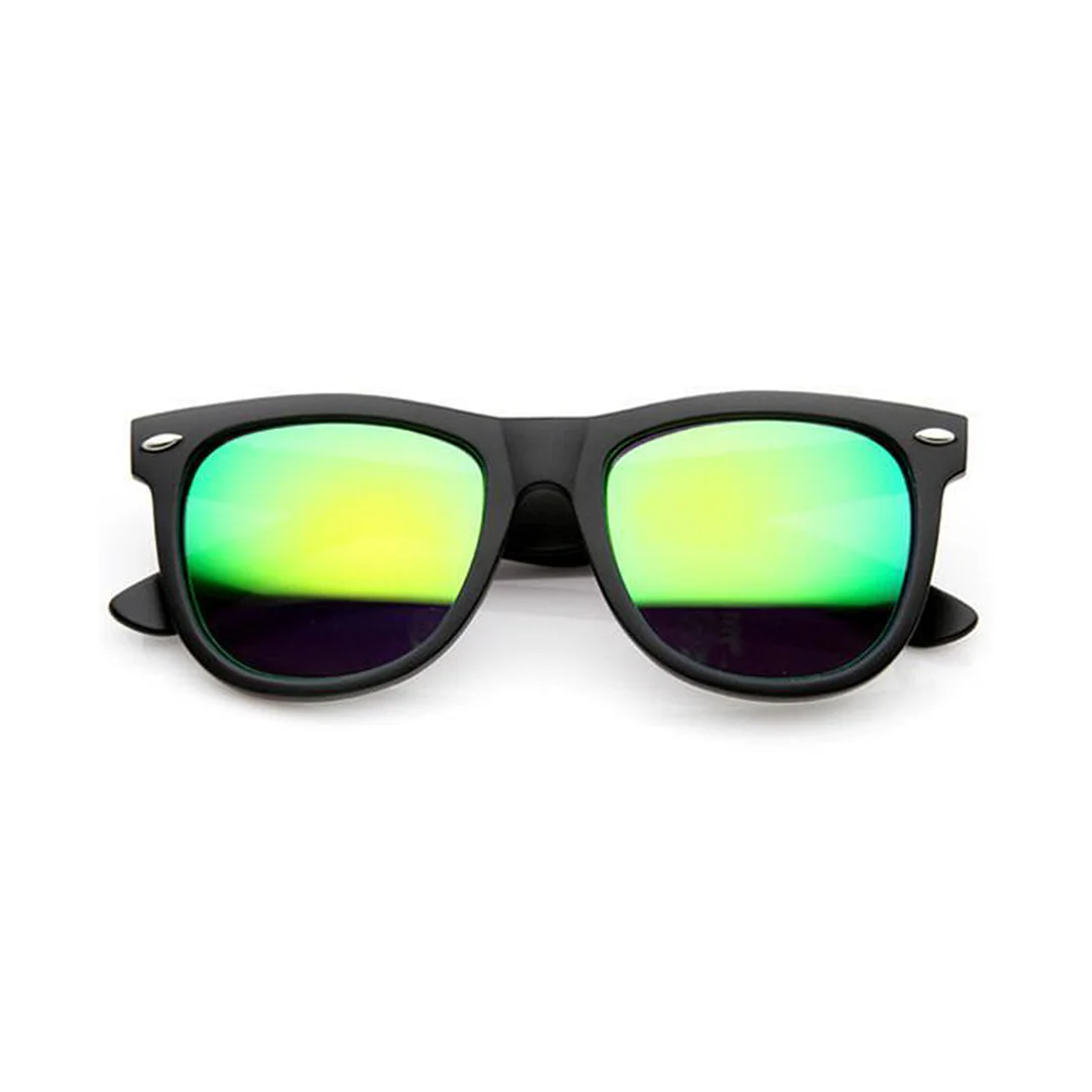 Classic black horned rim frame that features vibrant reflective color lenses.